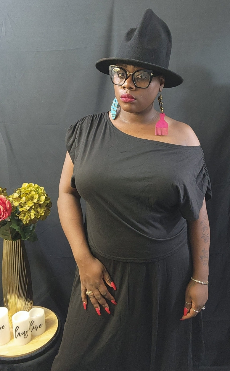 Top can be worn off shoulder. Top can be tied for cropped look.