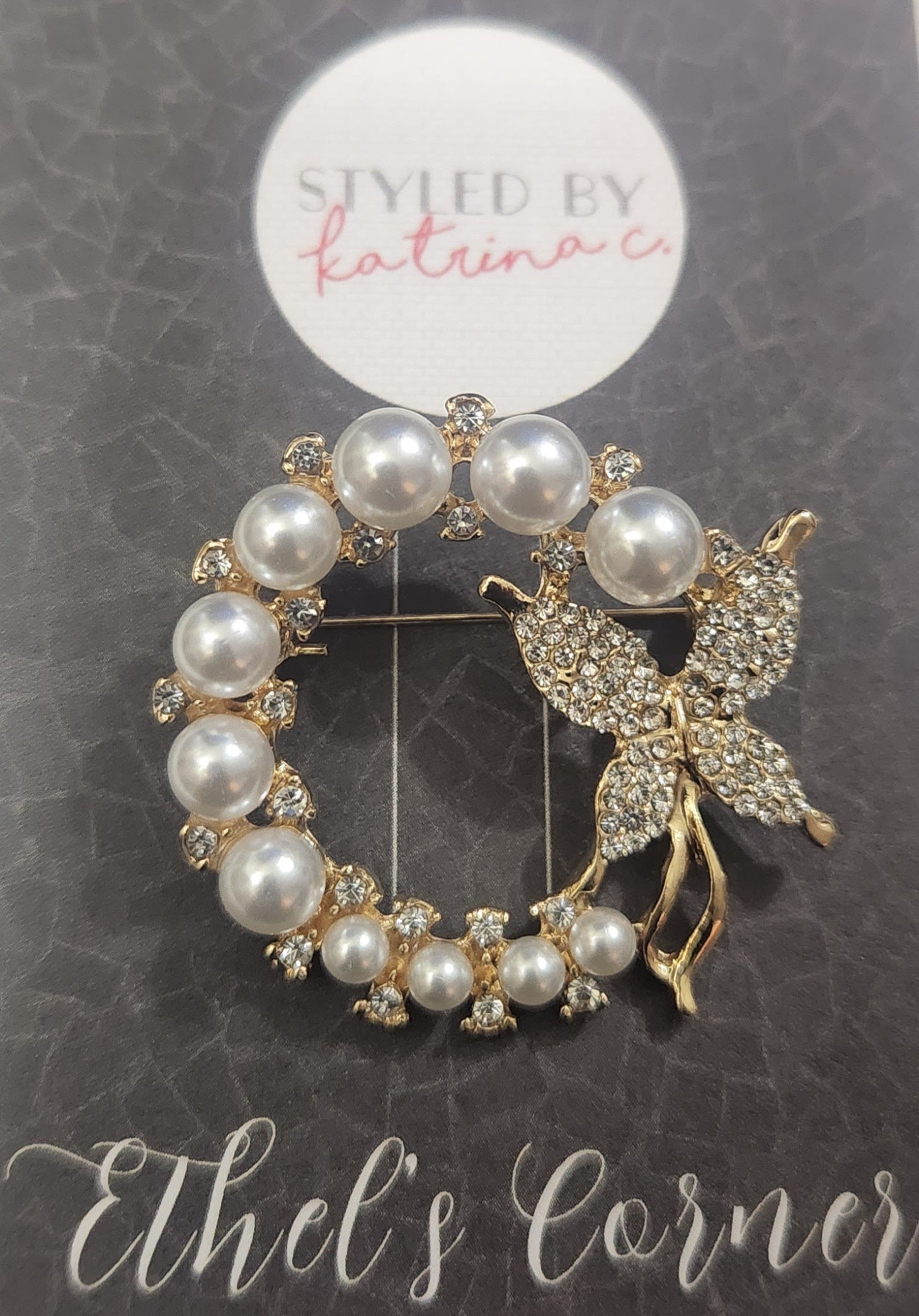 Beautiful round brooch with pearls, bling and a beautiful butterfly all on a gold standard brooch backing.