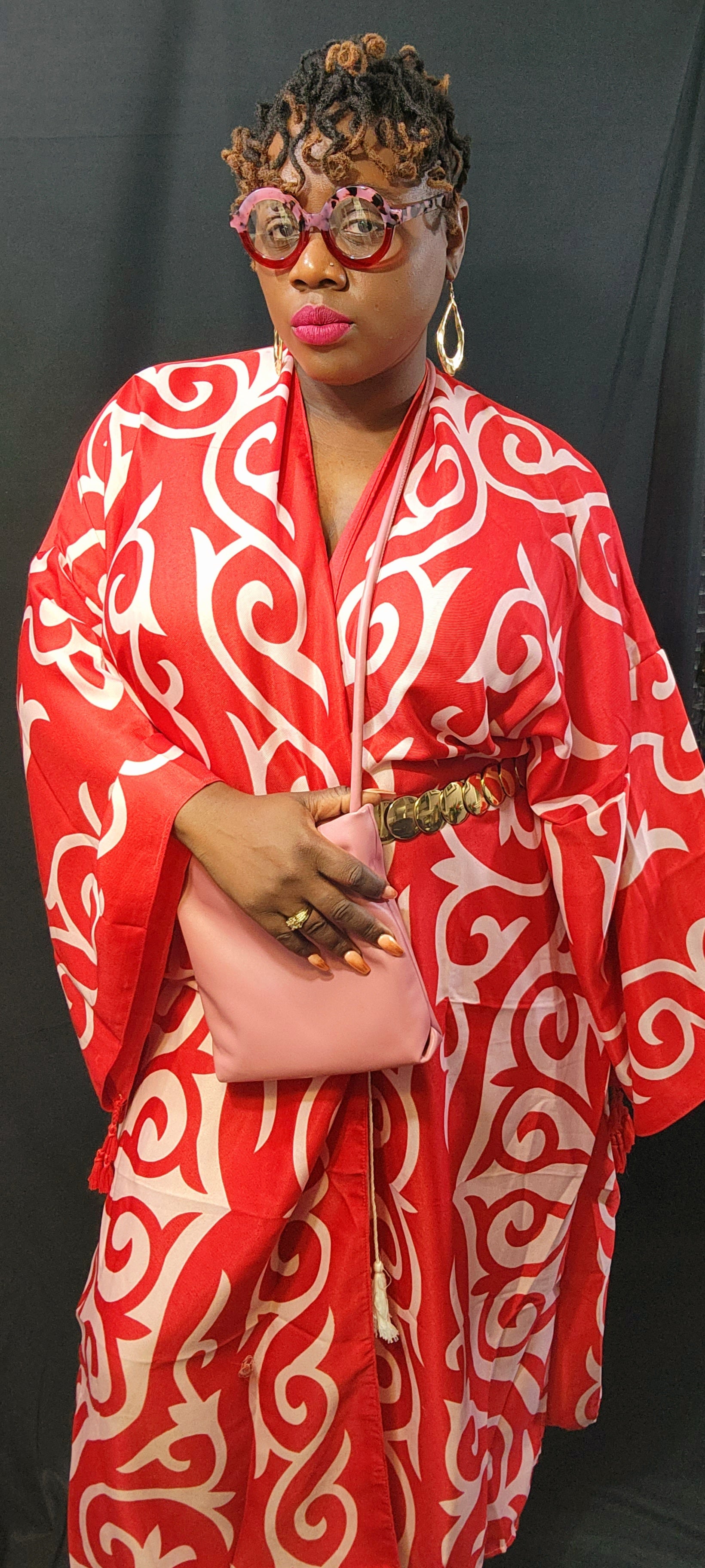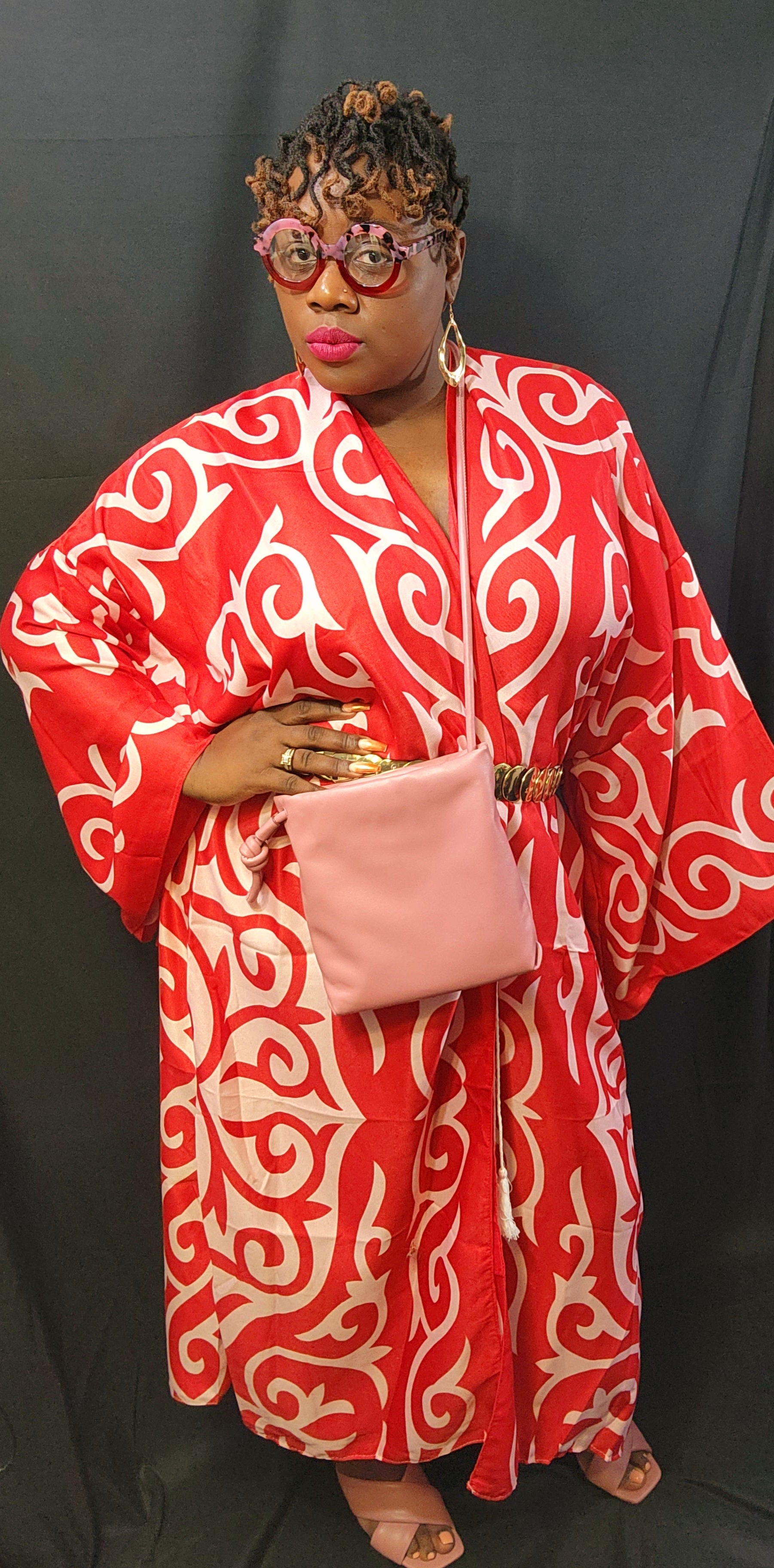 One size fits most kimono. 54" long. Model 5'5" 215 lbs. normally wears sizes 14/16.