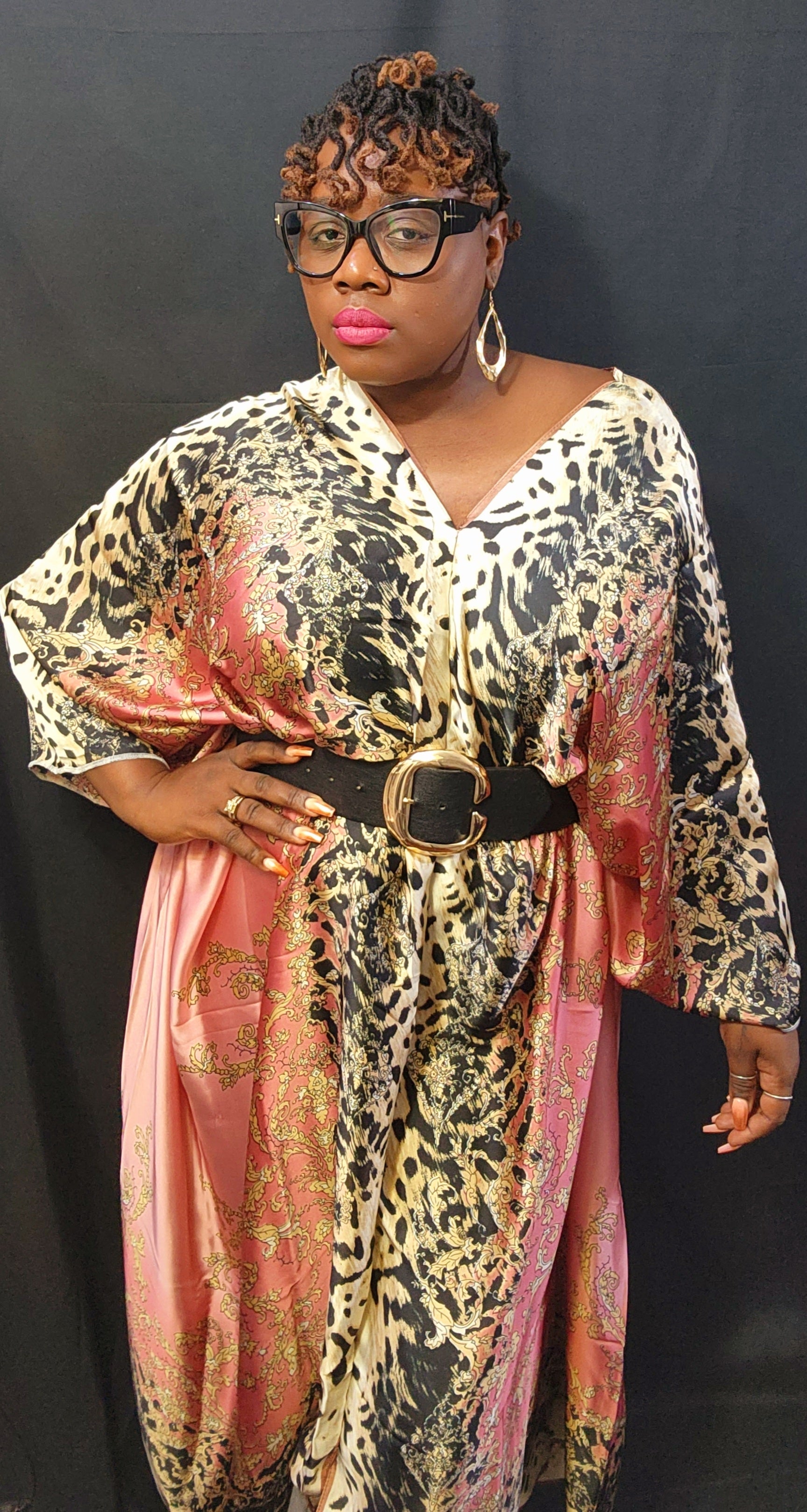 One size fits most flowy kimono dress. 54" long. Model 5'5" 215 lbs. Normally wears sizes 14/16.